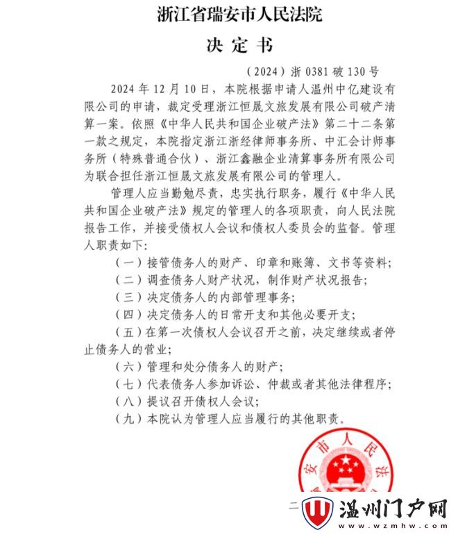 2024年12月10日,瑞安人民法院正式裁定,浙江恒晟破产重整,发布公告面向全国公开进行招商。