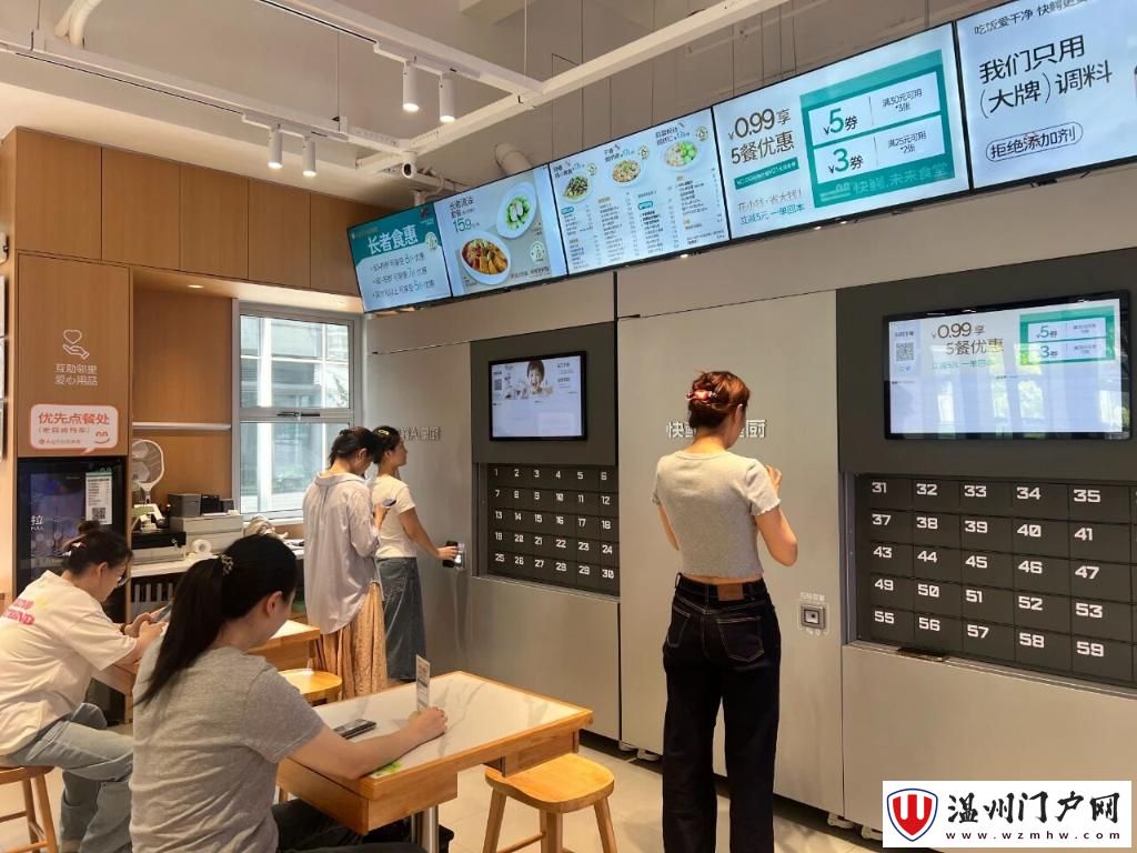 杭州拱墅区快鳄未来食堂内,食客在“智能鲜食机”前等待取餐。